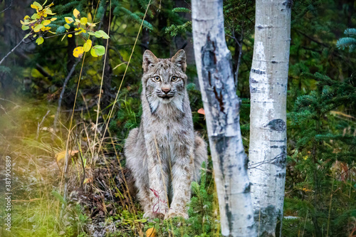 Close up wild lynx portrait in the forest looking at the camera