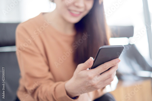 Close up woman hand holding mobile phone, She using in mobile applications and multimedia programs. copy space