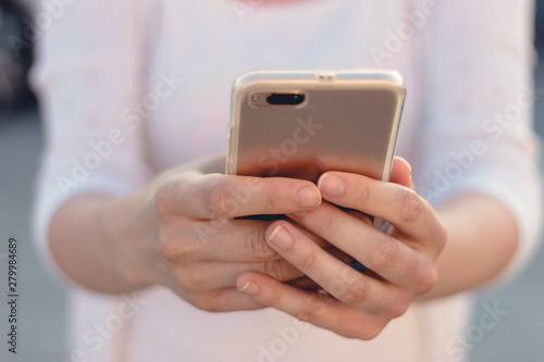 Close view of a young person holding and making use of a mobile phone or smart phone. Blurred background