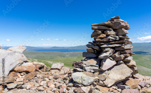 Close view of the stone landmark on the wall of Abuli prehistoric fortress . Paravani lake, mountains, sky with clouds