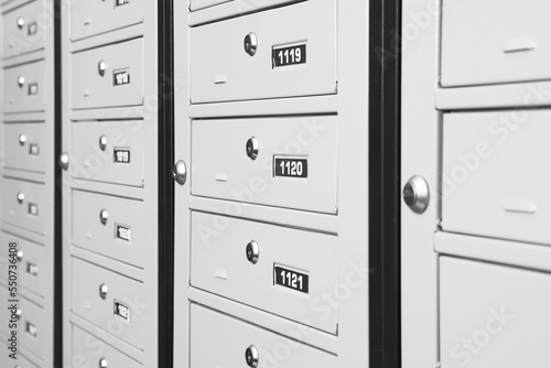 Closed metal mailboxes with keyholes and sequence numbers indoors