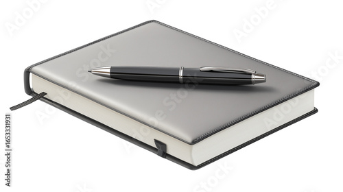 Closed notebook with pen placed on top, realistic shadows, isolated on white background