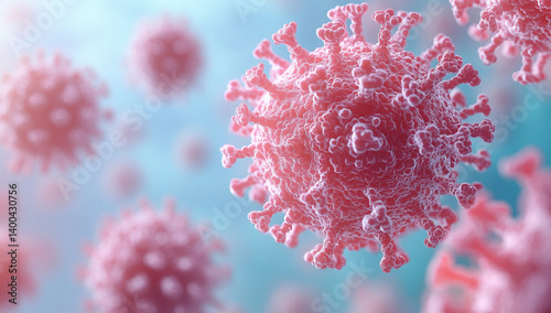 Close-up 3D rendering of a floating red virus particle in a deep blue aquatic background
