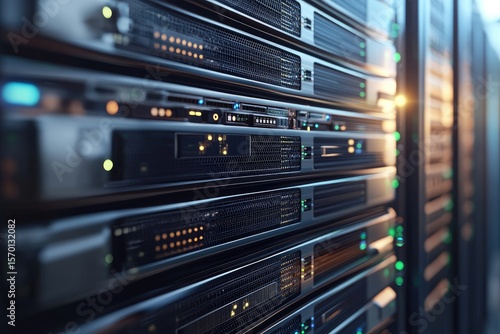 Close-up 3D rendering of server rack units with blinking indicator lights in a high-tech data center, perfect for illustrating cloud services, IT infrastructure, or cybersecurity concepts