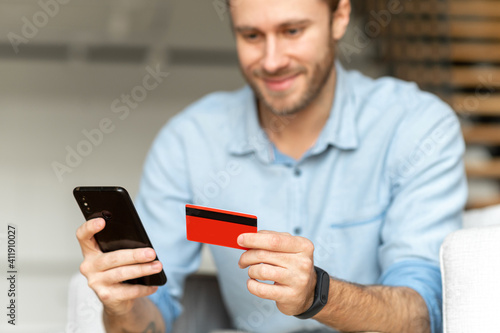 Close-up a credit card and a smartphone in male hands. Cheerful man typing a credit card number on her mobile phone, buying items from online application, transferring money, internet banking concept