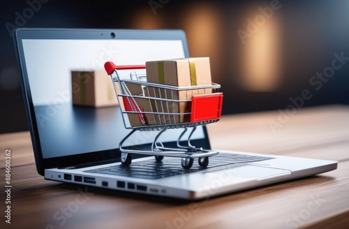 Close-up. A small shopping cart with cardboard boxes stands on a laptop keyboard. The concept of shopping through online stores. Delivery of goods from the Internet.