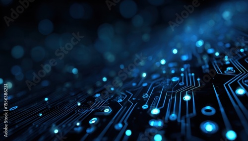 Close-up abstract of a blue circuit board with bokeh lights, a digital network concept