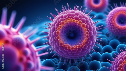 Close-up abstract virus cells or bacteria. Purple and blue gradient color, blue background