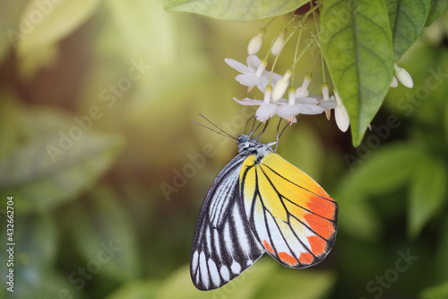 Closeup beautiful butterfly on wild water plum white flower in summer garden, monarch tiger butterfly wildlife insect in nature