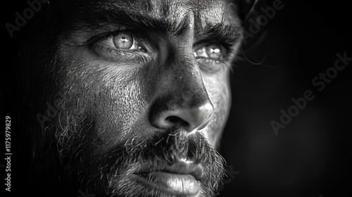 Close-up Black and White Portrait, a Man with Intense Gaze, Deep in Thought, Rough Rugged Features.