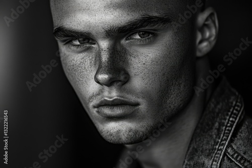 Close-up black and white portrait of a young man with freckles, intense gaze, and stubble.