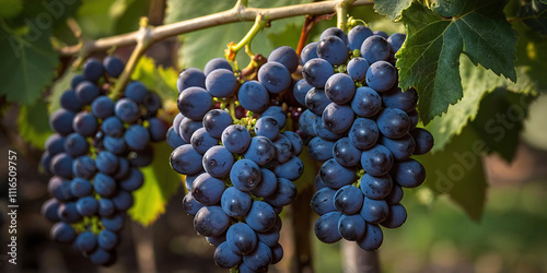 Close-up bunches of ripe grapes on a vine. Wine farm. Vineyard landscape