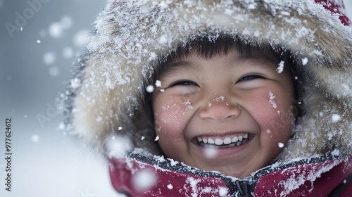 Close-up candid portrait of a young Inuit child laughing while playing in the snow, bundled up in traditional winter clothing, with snowflakes clinging to their fur hood