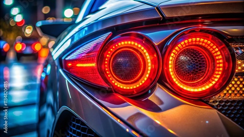 Closeup Capture of Sports Car Taillights with LED Lights Glowing Brightly, Showcasing Modern Design and Technological Excellence in Automotive Engineering