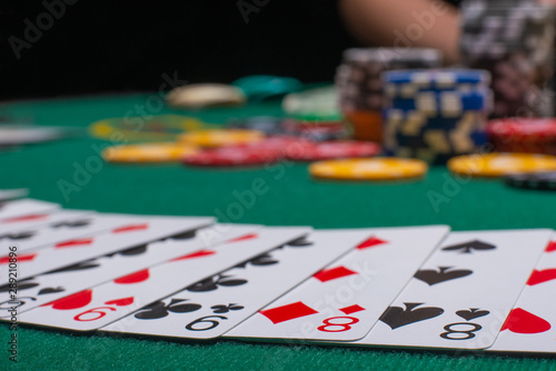Close-up cards for playing poker on a gaming table in a casino against a background of chips. Background for a gaming business