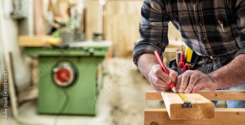 Close-up. Carpenter with pencil and the meter marks the measurement on a wooden board. Construction industry.