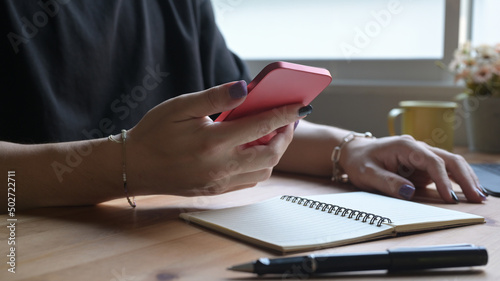 Closeup creative man hand typing on smart phone while sitting at his workplace.