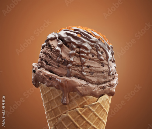 Close-up delicious coffee ice cream in waffle cone with chocolate cream and caramel isolated on brown background. 3D illustration