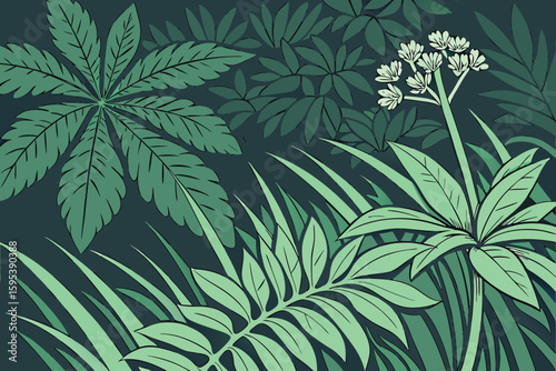 close-up, dense, lush, verdant, thriving, diverse foliage, various shades of green, vibrant leaves, intricate textures, natural patterns, intricate, otherworldly, surreal, dreamlike, intricate, deta