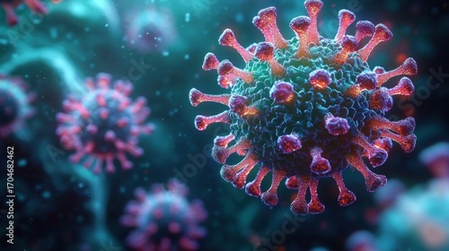 Close-up detailed visualization of virus particles with red spike proteins on a blue textured spherical body in a microscopic environment