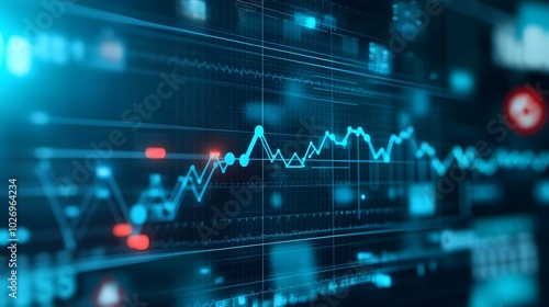 Close-up digital screen showing line graph with upward and downward trends, symbolizing cancer research progress and setbacks, medical charts and scientific symbols in background