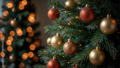 Close-up Elegant Christmas Tree Adorned with Golden Ornaments and Twinkling Lights, Creating a Warm and Festive Atmosphere