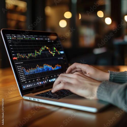 Close-up fo hands typing on a laptop with stock market graphs on the screen, editorial, office back