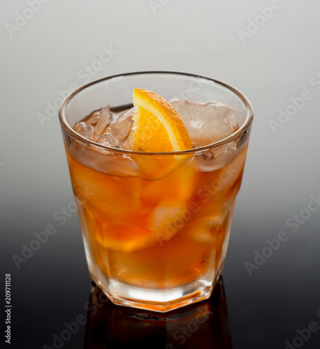 Closeup glass of negroni cocktail decorated with citrus on dark background.