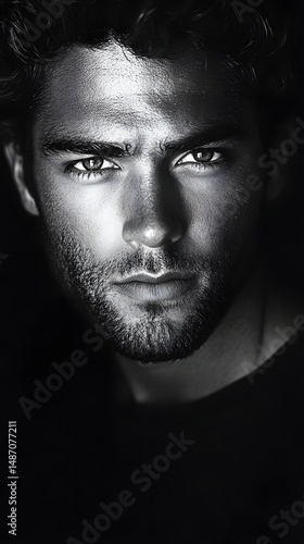 Close-up grayscale portrait of a man with intense gaze.