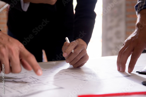 Closeup hands young caucasian architect woman looking laptop and working drawing blueprint for planning building house, engineer thinking and sketching blueprint for construction, industry concept.