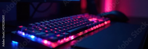 Close-up illuminated keyboard, game in progress, home office, stylish, leisure, competition