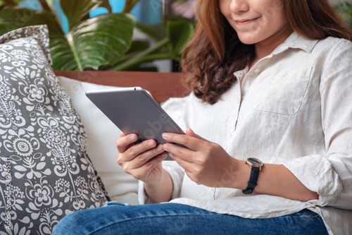 Closeup image of a beautiful asian woman holding and using tablet pc while sitting on sofa