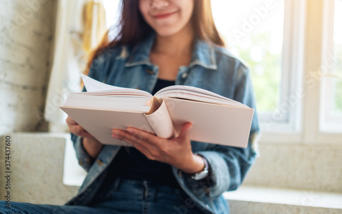 Closeup image of a beautiful asian woman sitting and reading book at home