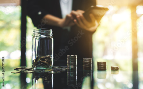 Closeup image of a businesswoman calculating with coins stack and a glass money jar for saving and financial concept