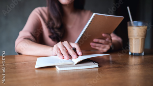Closeup image of a businesswoman working and writing on a notebook on wooden table