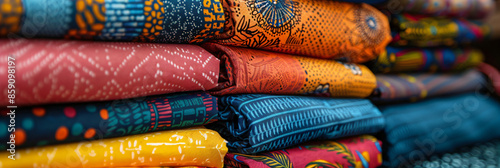 Close-up image of colorful African textiles and fabrics in a local market. Intricate patterns, textures and rich colors