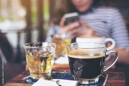 Closeup image of cups of hot coffee and tea on vintage wooden table in cafe with blur woman using smart phone in background