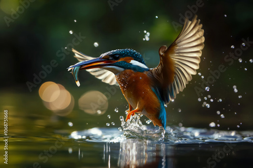 Close-up, kingfisher coming out of the water with a small fish in its beak