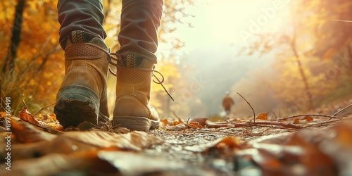 Close-up low angle photo of a woman's hiking boots as she hikes on a nature trail, with a backpack and walking poles. Stock photo with space for text. Hiking and outdoor adventure concept.