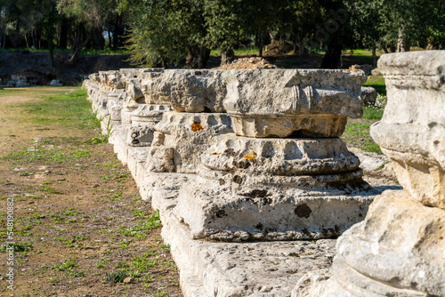close-up low angle view of old column bases in the Palestra in Ancient Olympia