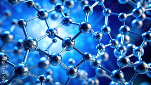 Close-up macro photo of a molecule's molecular structure against a bright blue background, highlighting intricate details and textures, background, biology