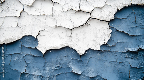 Close-up macro photograph of a surface exhibiting severely cracked and peeling paint. The paint is primarily in two colors: a lighter, off-white shade in the upper portion and a darker, desaturated