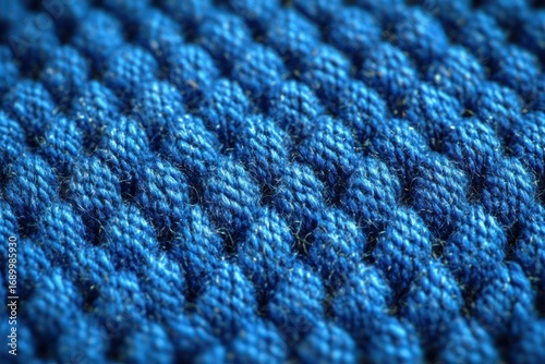 Close-up macro photograph of tightly knit blue woolen fabric showcasing detailed texture and fibers in a repeating pattern