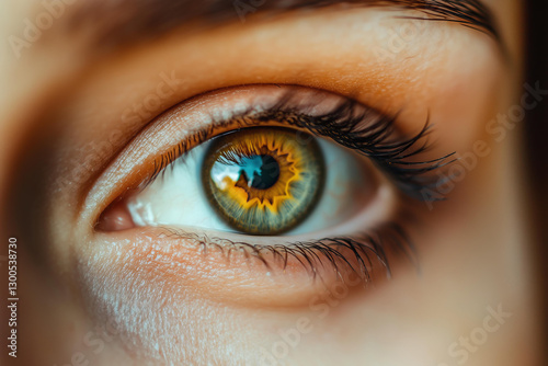 Close-up macro shot of a human eye with a mesmerizing golden-green iris, featuring intricate details and a striking reflection of a distant landscape.