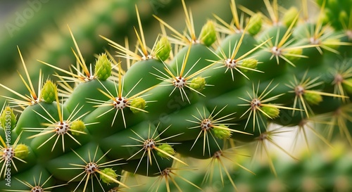 Close-up macro view of prickly green cactus branches with developing buds and sharp spines