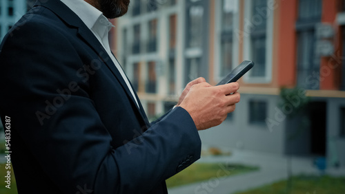 Close-up male hands touch mobile screen hold modern gadget phone device millennial adult man chatting send message in web chat online business communication check media content use virtual banking app