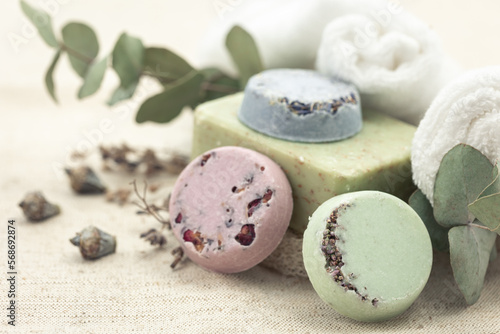 Close-up, multicolored handmade soap on a blurred background.