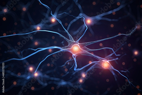 Close-up neuron within the nervous system. Concepts of neurology, neuroscience, and the complex communication pathways of the brain. For educational materials, medical publications, mental health.