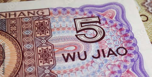 Closeup of 5 Wu Jiao chinese Renminbi currency banknote from 80s (focus on center)