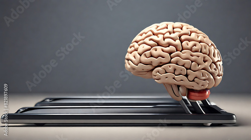 Closeup of a 3D human brain character running on a treadmill with copy space, brain training or exercise concept, minimalistic 3D style